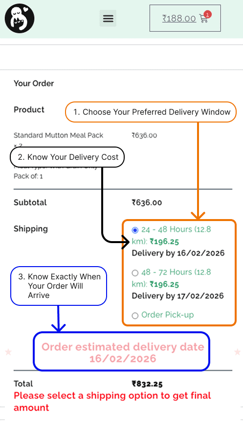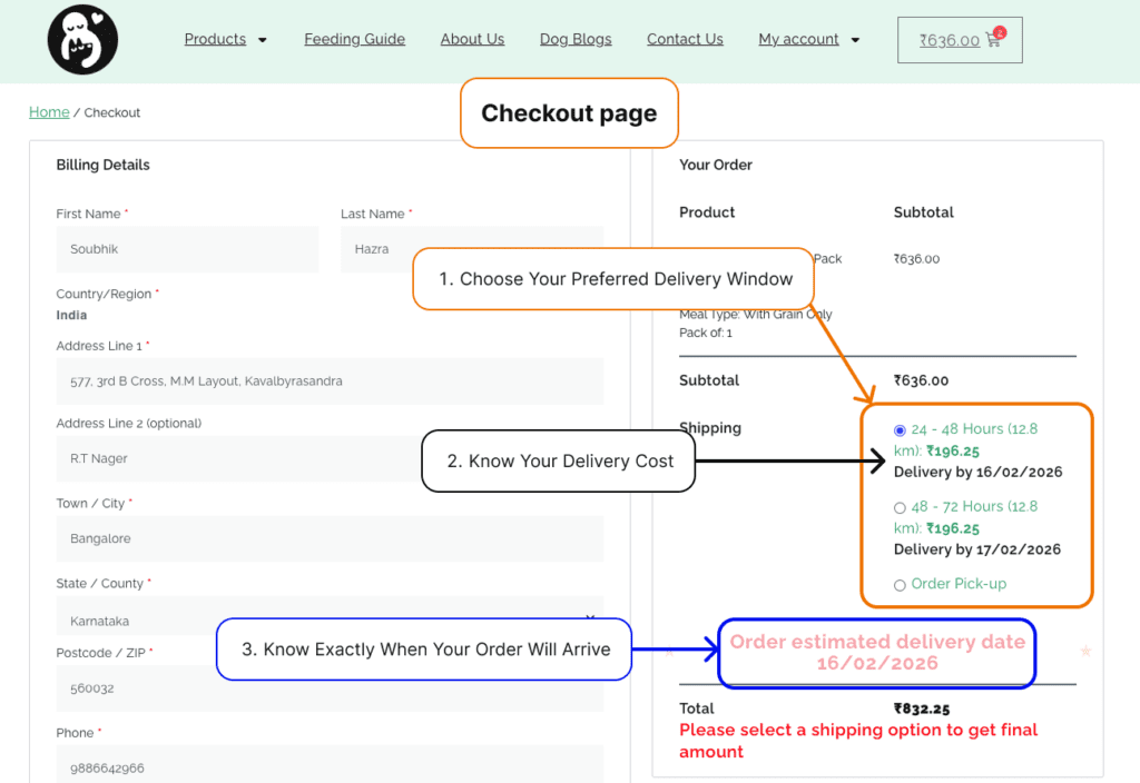 Seamless experience from order placement to home delivery of freshly cooked dog food in Bangalore.
