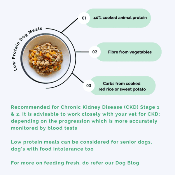 Our low protein meals with 40% cooked meat, is a safe option for senior dogs, whose activities have reduced. The 30% cooked meat option, is only for dogs suffering from chronic kidney or liver diseases.