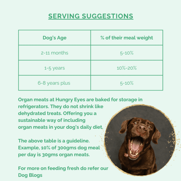 Hungry Eyes treats for pets are vacuum packed for a shelf life of one month in the refrigerator. Once the vacuum pack in open, transfer the contents to a dry & airtight container. Continue refrigerating and enjoy feeding your pet, the treats for upto 15 days from the date of opening the pack. Always use dry, clean, spoon or hands to handle the treats.